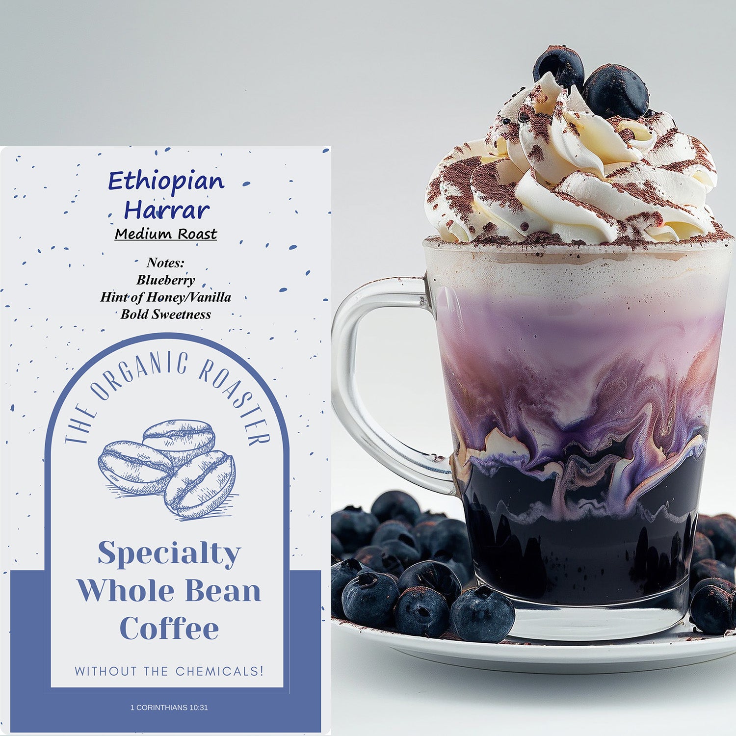 Experience the vibrant flavors of Ethiopia with our Harrar Organic Medium Roast Coffee. This artisanal brew delights with juicy blueberry notes, a subtle hint of honey and vanilla, and a bold sweetness that lingers with every sip.
